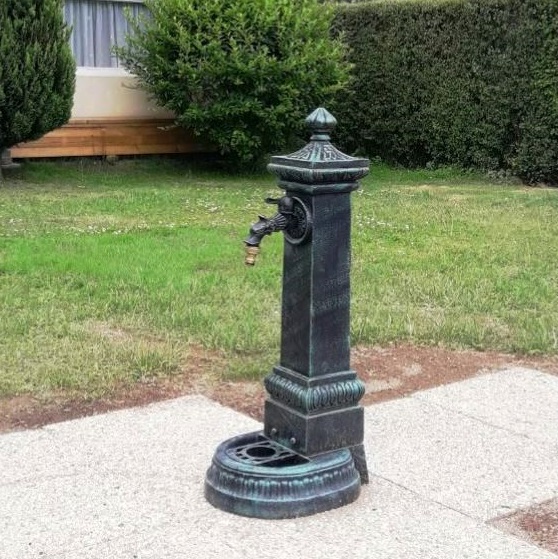 Tento vodovodný stĺpik je vyrobený z liatiny a má zelenú patinu, ktorá mu dodáva zaujímavý vzhľad. Vodovodný stĺpik je nielen praktickým prvkom, ale aj skvelou ozdobou záhrady.