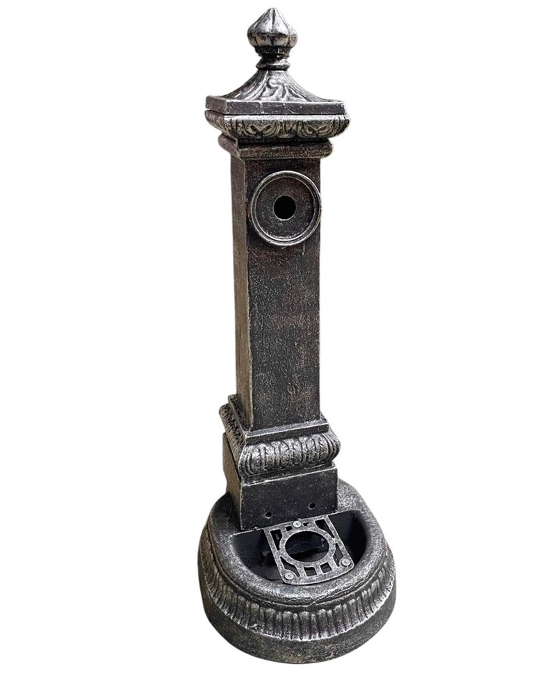 Tento vodovodný stĺpik je vyrobený z liatiny a má striebornú patinu, ktorá mu dodáva zaujímavý vzhľad. Vodovodný stĺpik je nielen praktickým prvkom, ale aj skvelou ozdobou záhrady.