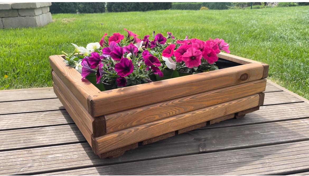 - Kvetináč je vyrobený z vysoko kvalitného dreva, ktoré je pevné a odolné. Drevo je ošetrené tak, aby odolávalo poveternostným vplyvom a predĺžilo životnosť kvetináča. Na tento účel slúži dvojitý náter impregnačným prostriedkom Sadolin Classic.