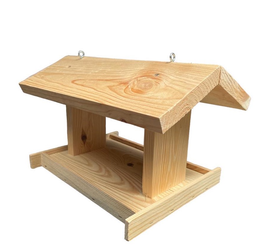 Krmítko má dvě očka na střeše, která umožňují snadné zavěšení na stromy, nebo jiná vhodná místa.