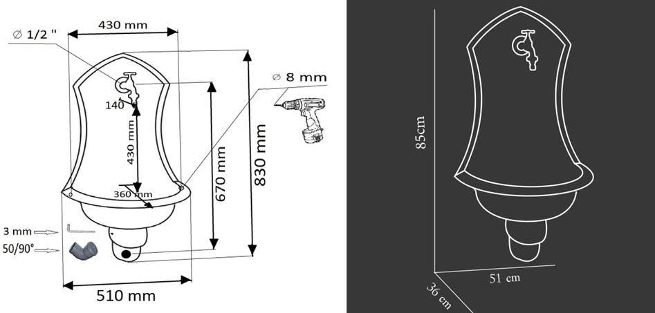 Napojenie na odpad: Možno vykonať pomocou vodovodného kolena DN50. Pri použití ozdobného krytu na odpadové koleno sa napojenie realizuje do steny.